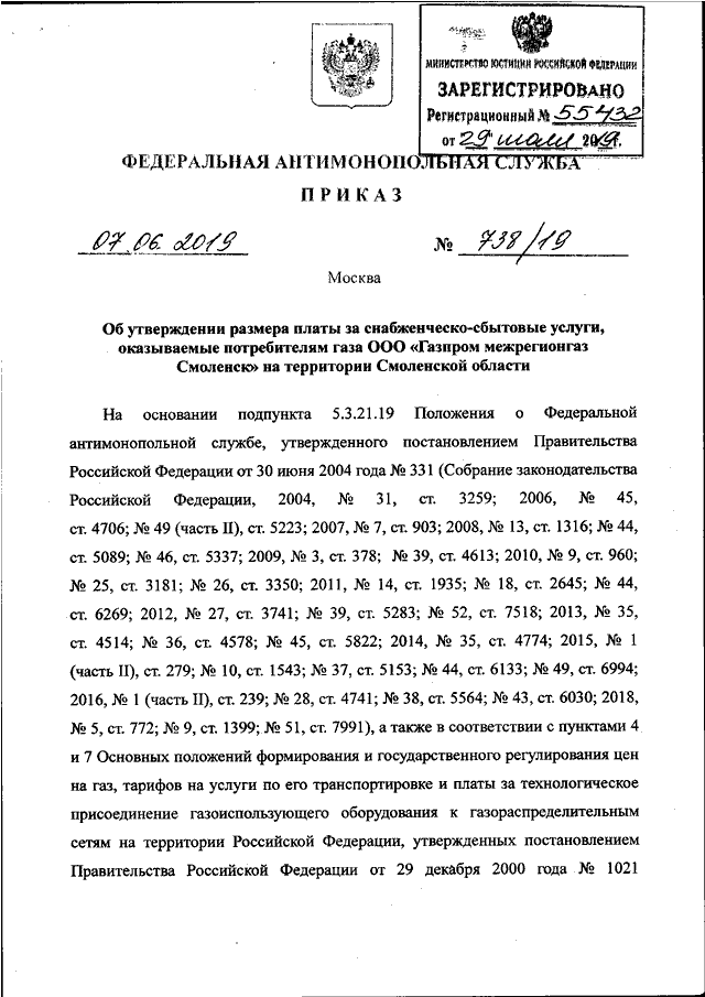 ПРИКАЗ Федеральной антимонопольной службы от 07.06.2019 N 738/19