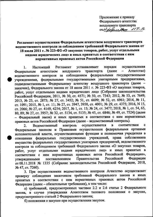 "ОБ УТВЕРЖДЕНИИ РЕГЛАМЕНТА ОСУЩЕСТВЛЕНИЯ ФЕДЕРАЛЬНЫМ АГЕНТСТВОМ ВОЗДУШНОГО ТРАНСПОРТА ВЕДОМСТВЕННОГО КОНТРОЛЯ ЗА СОБЛЮДЕНИЕМ ТРЕБОВАНИЙ ФЕДЕРАЛЬНОГО ЗАКОНА ОТ 18 ИЮЛЯ 2011 Г. N 223-ФЗ "О ЗАКУПКАХ ТОВАРОВ, РАБОТ, УСЛУГ ОТДЕЛЬНЫМИ ВИДАМИ ЮРИДИЧЕСКИХ ЛИЦ" И ИНЫХ ПРИНЯТЫХ В СООТВЕТСТВИИ С НИМ НОРМАТИВНЫХ ПРАВОВЫХ АКТОВ РОССИЙСКОЙ ФЕДЕРАЦИИ"