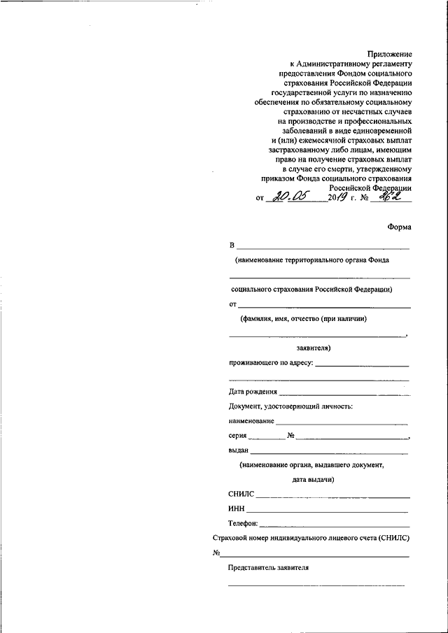 "ОБ УТВЕРЖДЕНИИ АДМИНИСТРАТИВНОГО РЕГЛАМЕНТА ФОНДА СОЦИАЛЬНОГО СТРАХОВАНИЯ РОССИЙСКОЙ ФЕДЕРАЦИИ ПО ПРЕДОСТАВЛЕНИЮ ГОСУДАРСТВЕННОЙ УСЛУГИ ПО НАЗНАЧЕНИЮ ОБЕСПЕЧЕНИЯ ПО ОБЯЗАТЕЛЬНОМУ СОЦИАЛЬНОМУ СТРАХОВАНИЮ ОТ НЕСЧАСТНЫХ СЛУЧАЕВ НА ПРОИЗВОДСТВЕ И ПРОФЕССИОНАЛЬНЫХ ЗАБОЛЕВАНИЙ В ВИДЕ ЕДИНОВРЕМЕННОЙ И (ИЛИ) ЕЖЕМЕСЯЧНОЙ СТРАХОВЫХ ВЫПЛАТ ЗАСТРАХОВАННОМУ ЛИБО ЛИЦАМ, ИМЕЮЩИМ ПРАВО НА ПОЛУЧЕНИЕ СТРАХОВЫХ ВЫПЛАТ В СЛУЧАЕ ЕГО СМЕРТИ"