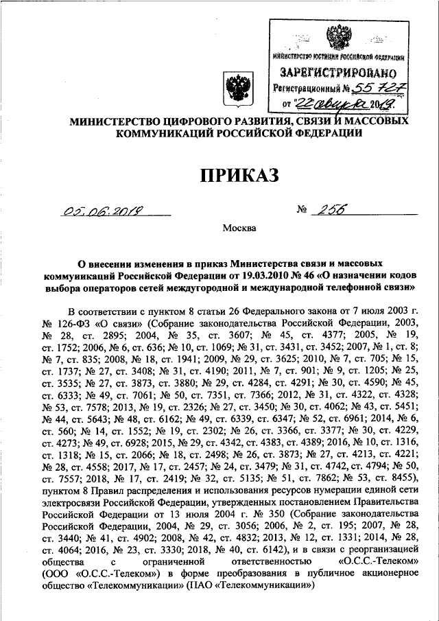 ПРИКАЗ Минкомсвязи РФ от 05.06.2019 N 256