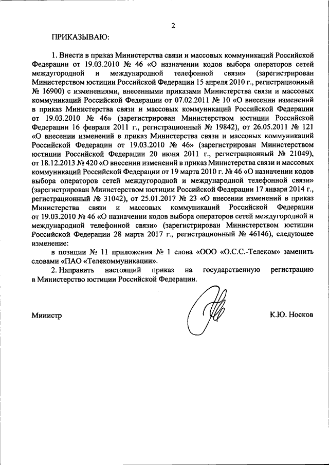 "О ВНЕСЕНИИ ИЗМЕНЕНИЯ В ПРИКАЗ МИНИСТЕРСТВА СВЯЗИ И МАССОВЫХ КОММУНИКАЦИЙ РОССИЙСКОЙ ФЕДЕРАЦИИ ОТ 19.03.2010 N 46 "О НАЗНАЧЕНИИ КОДОВ ВЫБОРА ОПЕРАТОРОВ СЕТЕЙ МЕЖДУГОРОДНОЙ И МЕЖДУНАРОДНОЙ ТЕЛЕФОННОЙ СВЯЗИ"