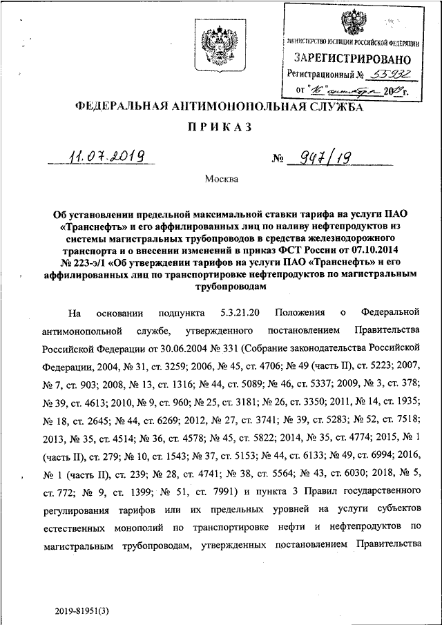 ПРИКАЗ Федеральной антимонопольной службы от 11.07.2019 N 947/19