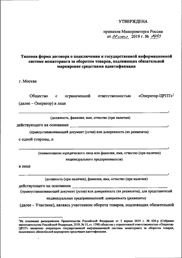 "ОБ УТВЕРЖДЕНИИ ТИПОВОЙ ФОРМЫ ДОГОВОРА О ПОДКЛЮЧЕНИИ К ГОСУДАРСТВЕННОЙ ИНФОРМАЦИОННОЙ СИСТЕМЕ МОНИТОРИНГА ЗА ОБОРОТОМ ТОВАРОВ, ПОДЛЕЖАЩИХ ОБЯЗАТЕЛЬНОЙ МАРКИРОВКЕ СРЕДСТВАМИ ИДЕНТИФИКАЦИИ"