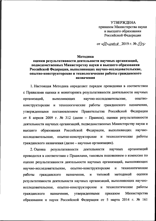 "ОБ УТВЕРЖДЕНИИ МЕТОДИКИ ОЦЕНКИ РЕЗУЛЬТАТИВНОСТИ ДЕЯТЕЛЬНОСТИ НАУЧНЫХ ОРГАНИЗАЦИЙ, ПОДВЕДОМСТВЕННЫХ МИНИСТЕРСТВУ НАУКИ И ВЫСШЕГО ОБРАЗОВАНИЯ РОССИЙСКОЙ ФЕДЕРАЦИИ, ВЫПОЛНЯЮЩИХ НАУЧНО - ИССЛЕДОВАТЕЛЬСКИЕ, ОПЫТНО - КОНСТРУКТОРСКИЕ И ТЕХНОЛОГИЧЕСКИЕ РАБОТЫ ГРАЖДАНСКОГО НАЗНАЧЕНИЯ"