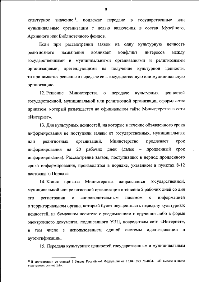 "ОБ УТВЕРЖДЕНИИ ПОРЯДКА ПЕРЕДАЧИ МИНИСТЕРСТВОМ КУЛЬТУРЫ РОССИЙСКОЙ ФЕДЕРАЦИИ КУЛЬТУРНЫХ ЦЕННОСТЕЙ, В ТОМ ЧИСЛЕ РЕЛИГИОЗНОГО НАЗНАЧЕНИЯ, ОБРАЩЕННЫХ В СУДЕБНОМ ПОРЯДКЕ В СОБСТВЕННОСТЬ ГОСУДАРСТВА, В ГОСУДАРСТВЕННЫЕ ИЛИ МУНИЦИПАЛЬНЫЕ ОРГАНИЗАЦИИ, ОСУЩЕСТВЛЯЮЩИЕ ПОСТОЯННОЕ ХРАНЕНИЕ КУЛЬТУРНЫХ ЦЕННОСТЕЙ, ИЛИ РЕЛИГИОЗНЫЕ ОРГАНИЗАЦИИ РОССИЙСКОЙ ФЕДЕРАЦИИ"