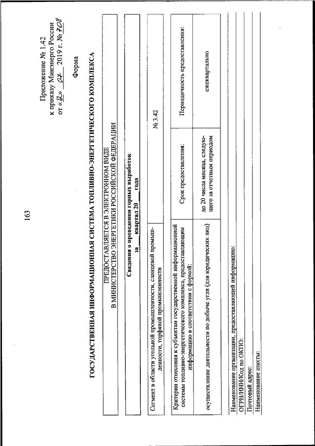 "ОБ УТВЕРЖДЕНИИ ФОРМ ПРЕДОСТАВЛЕНИЯ В ОБЯЗАТЕЛЬНОМ ПОРЯДКЕ ЮРИДИЧЕСКИМИ ЛИЦАМИ ИНФОРМАЦИИ ДЛЯ ВКЛЮЧЕНИЯ В СЕГМЕНТ В ОБЛАСТИ УГОЛЬНОЙ ПРОМЫШЛЕННОСТИ, СЛАНЦЕВОЙ ПРОМЫШЛЕННОСТИ, ТОРФЯНОЙ ПРОМЫШЛЕННОСТИ ГОСУДАРСТВЕННОЙ ИНФОРМАЦИОННОЙ СИСТЕМЫ ТОПЛИВНО - ЭНЕРГЕТИЧЕСКОГО КОМПЛЕКСА И ТРЕБОВАНИЙ К ЗАПОЛНЕНИЮ ЭТИХ ФОРМ"