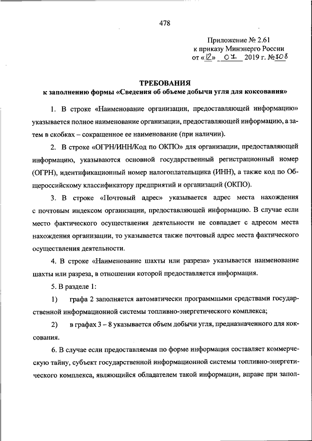 "ОБ УТВЕРЖДЕНИИ ФОРМ ПРЕДОСТАВЛЕНИЯ В ОБЯЗАТЕЛЬНОМ ПОРЯДКЕ ЮРИДИЧЕСКИМИ ЛИЦАМИ ИНФОРМАЦИИ ДЛЯ ВКЛЮЧЕНИЯ В СЕГМЕНТ В ОБЛАСТИ УГОЛЬНОЙ ПРОМЫШЛЕННОСТИ, СЛАНЦЕВОЙ ПРОМЫШЛЕННОСТИ, ТОРФЯНОЙ ПРОМЫШЛЕННОСТИ ГОСУДАРСТВЕННОЙ ИНФОРМАЦИОННОЙ СИСТЕМЫ ТОПЛИВНО - ЭНЕРГЕТИЧЕСКОГО КОМПЛЕКСА И ТРЕБОВАНИЙ К ЗАПОЛНЕНИЮ ЭТИХ ФОРМ"