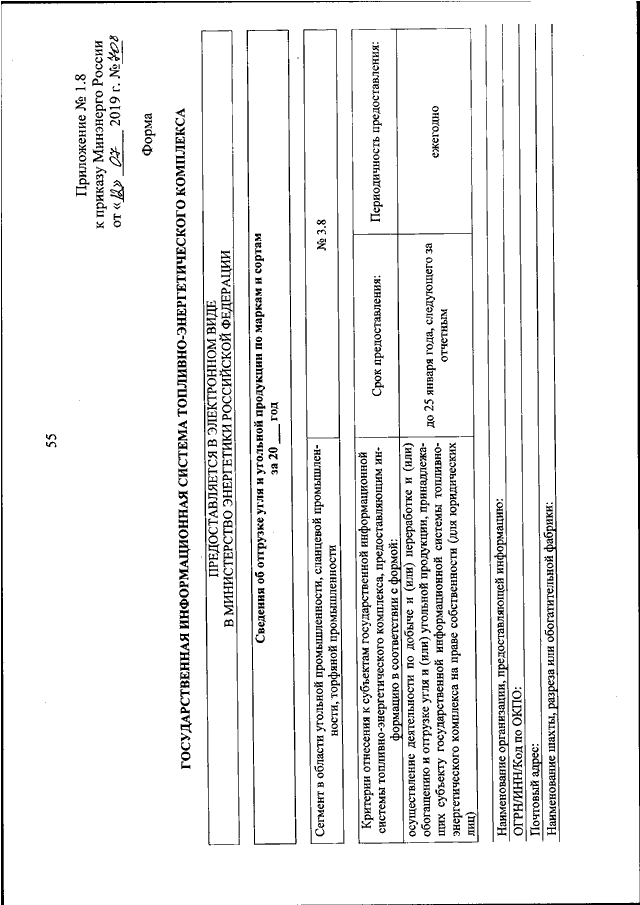 "ОБ УТВЕРЖДЕНИИ ФОРМ ПРЕДОСТАВЛЕНИЯ В ОБЯЗАТЕЛЬНОМ ПОРЯДКЕ ЮРИДИЧЕСКИМИ ЛИЦАМИ ИНФОРМАЦИИ ДЛЯ ВКЛЮЧЕНИЯ В СЕГМЕНТ В ОБЛАСТИ УГОЛЬНОЙ ПРОМЫШЛЕННОСТИ, СЛАНЦЕВОЙ ПРОМЫШЛЕННОСТИ, ТОРФЯНОЙ ПРОМЫШЛЕННОСТИ ГОСУДАРСТВЕННОЙ ИНФОРМАЦИОННОЙ СИСТЕМЫ ТОПЛИВНО - ЭНЕРГЕТИЧЕСКОГО КОМПЛЕКСА И ТРЕБОВАНИЙ К ЗАПОЛНЕНИЮ ЭТИХ ФОРМ"