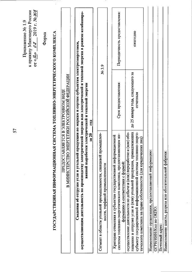 "ОБ УТВЕРЖДЕНИИ ФОРМ ПРЕДОСТАВЛЕНИЯ В ОБЯЗАТЕЛЬНОМ ПОРЯДКЕ ЮРИДИЧЕСКИМИ ЛИЦАМИ ИНФОРМАЦИИ ДЛЯ ВКЛЮЧЕНИЯ В СЕГМЕНТ В ОБЛАСТИ УГОЛЬНОЙ ПРОМЫШЛЕННОСТИ, СЛАНЦЕВОЙ ПРОМЫШЛЕННОСТИ, ТОРФЯНОЙ ПРОМЫШЛЕННОСТИ ГОСУДАРСТВЕННОЙ ИНФОРМАЦИОННОЙ СИСТЕМЫ ТОПЛИВНО - ЭНЕРГЕТИЧЕСКОГО КОМПЛЕКСА И ТРЕБОВАНИЙ К ЗАПОЛНЕНИЮ ЭТИХ ФОРМ"