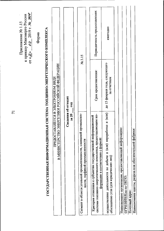 "ОБ УТВЕРЖДЕНИИ ФОРМ ПРЕДОСТАВЛЕНИЯ В ОБЯЗАТЕЛЬНОМ ПОРЯДКЕ ЮРИДИЧЕСКИМИ ЛИЦАМИ ИНФОРМАЦИИ ДЛЯ ВКЛЮЧЕНИЯ В СЕГМЕНТ В ОБЛАСТИ УГОЛЬНОЙ ПРОМЫШЛЕННОСТИ, СЛАНЦЕВОЙ ПРОМЫШЛЕННОСТИ, ТОРФЯНОЙ ПРОМЫШЛЕННОСТИ ГОСУДАРСТВЕННОЙ ИНФОРМАЦИОННОЙ СИСТЕМЫ ТОПЛИВНО - ЭНЕРГЕТИЧЕСКОГО КОМПЛЕКСА И ТРЕБОВАНИЙ К ЗАПОЛНЕНИЮ ЭТИХ ФОРМ"
