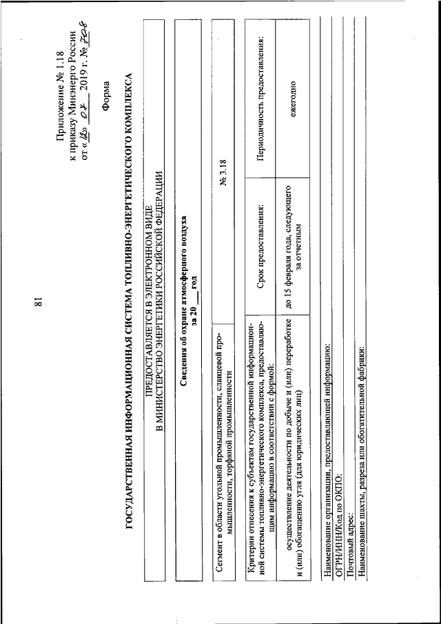 "ОБ УТВЕРЖДЕНИИ ФОРМ ПРЕДОСТАВЛЕНИЯ В ОБЯЗАТЕЛЬНОМ ПОРЯДКЕ ЮРИДИЧЕСКИМИ ЛИЦАМИ ИНФОРМАЦИИ ДЛЯ ВКЛЮЧЕНИЯ В СЕГМЕНТ В ОБЛАСТИ УГОЛЬНОЙ ПРОМЫШЛЕННОСТИ, СЛАНЦЕВОЙ ПРОМЫШЛЕННОСТИ, ТОРФЯНОЙ ПРОМЫШЛЕННОСТИ ГОСУДАРСТВЕННОЙ ИНФОРМАЦИОННОЙ СИСТЕМЫ ТОПЛИВНО - ЭНЕРГЕТИЧЕСКОГО КОМПЛЕКСА И ТРЕБОВАНИЙ К ЗАПОЛНЕНИЮ ЭТИХ ФОРМ"