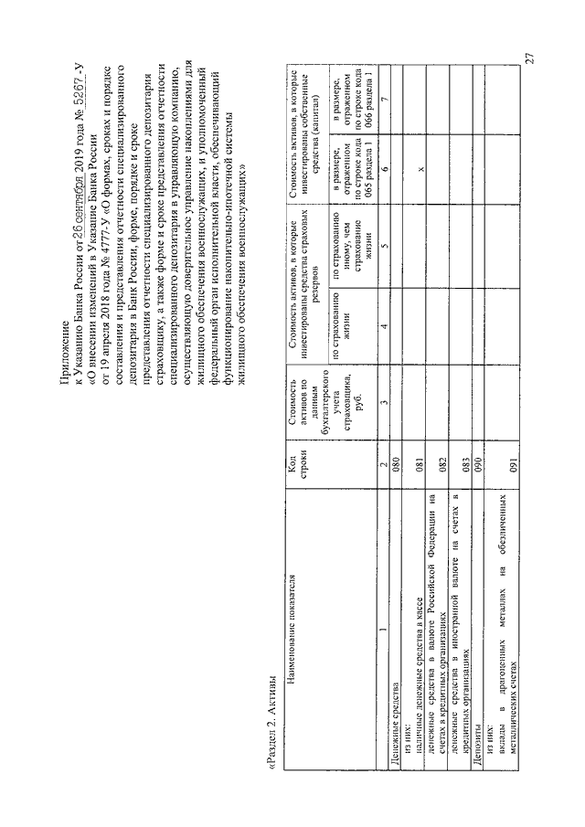 "О ВНЕСЕНИИ ИЗМЕНЕНИЙ В УКАЗАНИЕ БАНКА РОССИИ ОТ 19 АПРЕЛЯ 2018 Г. N 4777-У "О ФОРМАХ, СРОКАХ И ПОРЯДКЕ СОСТАВЛЕНИЯ И ПРЕДСТАВЛЕНИЯ ОТЧЕТНОСТИ СПЕЦИАЛИЗИРОВАННОГО ДЕПОЗИТАРИЯ В БАНК РОССИИ, ФОРМЕ, ПОРЯДКЕ И СРОКЕ ПРЕДСТАВЛЕНИЯ ОТЧЕТНОСТИ СПЕЦИАЛИЗИРОВАННОГО ДЕПОЗИТАРИЯ СТРАХОВЩИКУ, А ТАКЖЕ ФОРМЕ И СРОКЕ ПРЕДСТАВЛЕНИЯ ОТЧЕТНОСТИ СПЕЦИАЛИЗИРОВАННОГО ДЕПОЗИТАРИЯ В УПРАВЛЯЮЩУЮ КОМПАНИЮ, ОСУЩЕСТВЛЯЮЩУЮ ДОВЕРИТЕЛЬНОЕ УПРАВЛЕНИЕ НАКОПЛЕНИЯМИ ДЛЯ ЖИЛИЩНОГО ОБЕСПЕЧЕНИЯ ВОЕННОСЛУЖАЩИХ, И УПОЛНОМОЧЕННЫЙ ФЕДЕРАЛЬНЫЙ ОРГАН ИСПОЛНИТЕЛЬНОЙ ВЛАСТИ, ОБЕСПЕЧИВАЮЩИЙ ФУНКЦИОНИРОВАНИЕ НАКОПИТЕЛЬНО - ИПОТЕЧНОЙ СИСТЕМЫ ЖИЛИЩНОГО ОБЕСПЕЧЕНИЯ ВОЕННОСЛУЖАЩИХ"