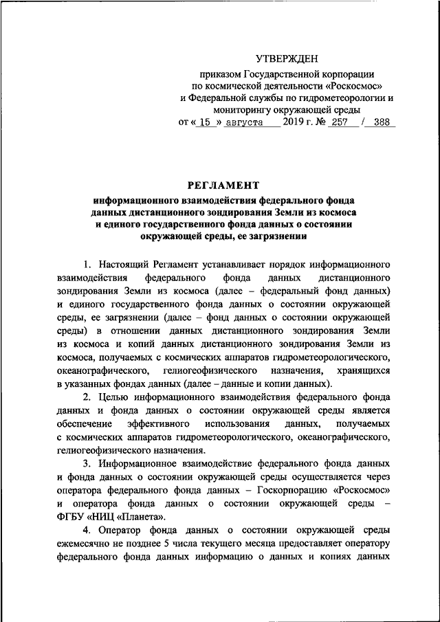 "Роскосмос" N 257, Росгидромета N 388 от 15.08.2019 "ОБ УТВЕРЖДЕНИИ РЕГЛАМЕНТА ИНФОРМАЦИОННОГО ВЗАИМОДЕЙСТВИЯ ФЕДЕРАЛЬНОГО ФОНДА ДАННЫХ ДИСТАНЦИОННОГО ЗОНДИРОВАНИЯ ЗЕМЛИ ИЗ КОСМОСА И ЕДИНОГО ГОСУДАРСТВЕННОГО ФОНДА ДАННЫХ О СОСТОЯНИИ ОКРУЖАЮЩЕЙ СРЕДЫ, ЕЕ ЗАГРЯЗНЕНИИ"