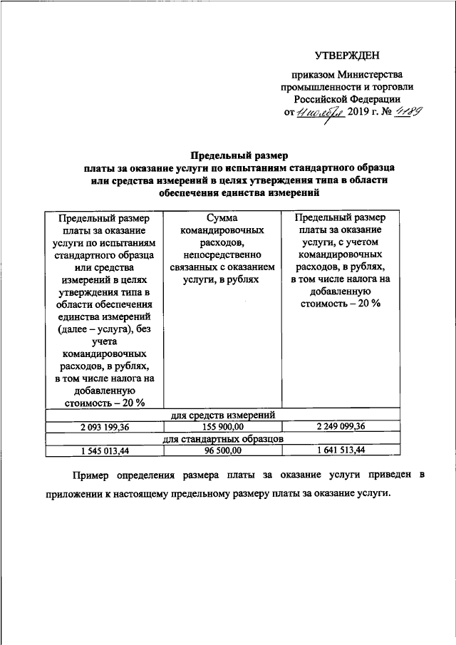 "ОБ УТВЕРЖДЕНИИ МЕТОДИКИ ОПРЕДЕЛЕНИЯ РАЗМЕРА ПЛАТЫ ЗА ОКАЗАНИЕ УСЛУГИ ПО ИСПЫТАНИЯМ СТАНДАРТНОГО ОБРАЗЦА ИЛИ СРЕДСТВА ИЗМЕРЕНИЙ В ЦЕЛЯХ УТВЕРЖДЕНИЯ ТИПА В ОБЛАСТИ ОБЕСПЕЧЕНИЯ ЕДИНСТВА ИЗМЕРЕНИЙ И ПРЕДЕЛЬНОГО РАЗМЕРА ПЛАТЫ ЗА ОКАЗАНИЕ УКАЗАННОЙ УСЛУГИ"