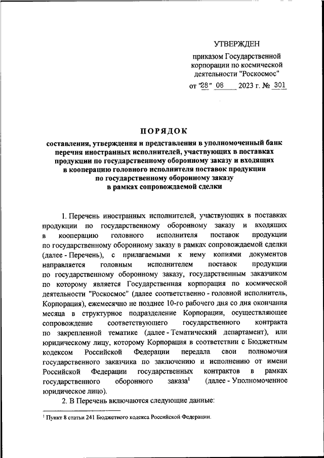 "Роскосмос" от 28.08.2023 N 301 "ОБ УТВЕРЖДЕНИИ ПОРЯДКА СОСТАВЛЕНИЯ, УТВЕРЖДЕНИЯ И ПРЕДСТАВЛЕНИЯ В УПОЛНОМОЧЕННЫЙ БАНК ПЕРЕЧНЯ ИНОСТРАННЫХ ИСПОЛНИТЕЛЕЙ, УЧАСТВУЮЩИХ В ПОСТАВКАХ ПРОДУКЦИИ ПО ГОСУДАРСТВЕННОМУ ОБОРОННОМУ ЗАКАЗУ И ВХОДЯЩИХ В КООПЕРАЦИЮ ГОЛОВНОГО ИСПОЛНИТЕЛЯ ПОСТАВОК ПРОДУКЦИИ ПО ГОСУДАРСТВЕННОМУ ОБОРОННОМУ ЗАКАЗУ В РАМКАХ СОПРОВОЖДАЕМОЙ СДЕЛКИ"