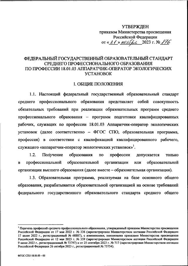 "ОБ УТВЕРЖДЕНИИ ФЕДЕРАЛЬНОГО ГОСУДАРСТВЕННОГО ОБРАЗОВАТЕЛЬНОГО СТАНДАРТА СРЕДНЕГО ПРОФЕССИОНАЛЬНОГО ОБРАЗОВАНИЯ ПО ПРОФЕССИИ 18.01.03 АППАРАТЧИК - ОПЕРАТОР ЭКОЛОГИЧЕСКИХ УСТАНОВОК"