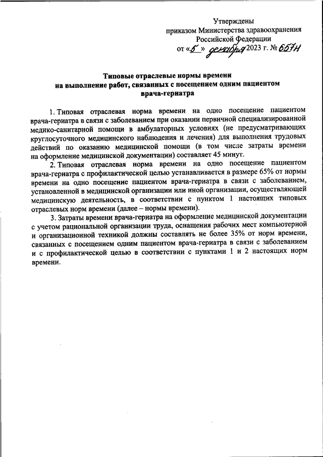 "ОБ УТВЕРЖДЕНИИ ТИПОВЫХ ОТРАСЛЕВЫХ НОРМ ВРЕМЕНИ НА ВЫПОЛНЕНИЕ РАБОТ, СВЯЗАННЫХ С ПОСЕЩЕНИЕМ ОДНИМ ПАЦИЕНТОМ ВРАЧА-ГЕРИАТРА"