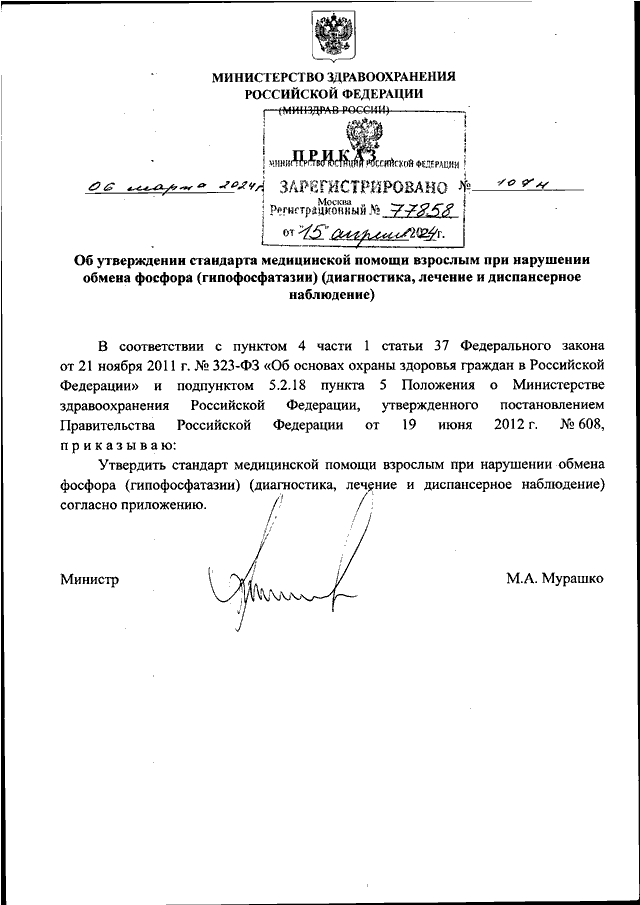 "ОБ УТВЕРЖДЕНИИ СТАНДАРТА МЕДИЦИНСКОЙ ПОМОЩИ ВЗРОСЛЫМ ПРИ НАРУШЕНИИ ОБМЕНА ФОСФОРА (ГИПОФОСФАТАЗИИ) (ДИАГНОСТИКА, ЛЕЧЕНИЕ И ДИСПАНСЕРНОЕ НАБЛЮДЕНИЕ)"