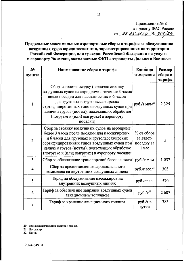 "ОБ УТВЕРЖДЕНИИ ПРЕДЕЛЬНЫХ МАКСИМАЛЬНЫХ АЭРОПОРТОВЫХ СБОРОВ И ТАРИФОВ ЗА ОБСЛУЖИВАНИЕ ВОЗДУШНЫХ СУДОВ ЮРИДИЧЕСКИХ ЛИЦ, ЗАРЕГИСТРИРОВАННЫХ НА ТЕРРИТОРИИ РОССИЙСКОЙ ФЕДЕРАЦИИ, ИЛИ ГРАЖДАН РОССИЙСКОЙ ФЕДЕРАЦИИ НА УСЛУГИ В АЭРОПОРТАХ АЯН (МУНУК), БОГОРОДСКОЕ, ЗЕЯ, ОХОТСК, ТЫНДА, ХЕРПУЧИ, ЧУМИКАН, ЭКИМЧАН, ОКАЗЫВАЕМЫЕ ФКП "АЭРОПОРТЫ ДАЛЬНЕГО ВОСТОКА"