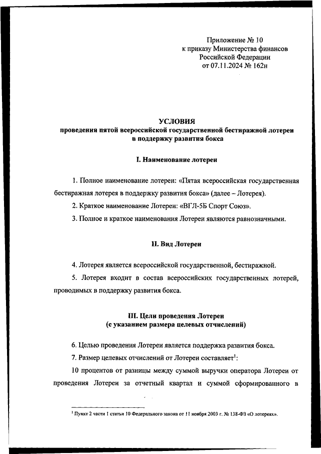 "ОБ УТВЕРЖДЕНИИ УСЛОВИЙ ПРОВЕДЕНИЯ 5 ТИРАЖНЫХ ВСЕРОССИЙСКИХ ГОСУДАРСТВЕННЫХ ЛОТЕРЕЙ И 10 БЕСТИРАЖНЫХ ВСЕРОССИЙСКИХ ГОСУДАРСТВЕННЫХ ЛОТЕРЕЙ В ПОДДЕРЖКУ РАЗВИТИЯ БОКСА"