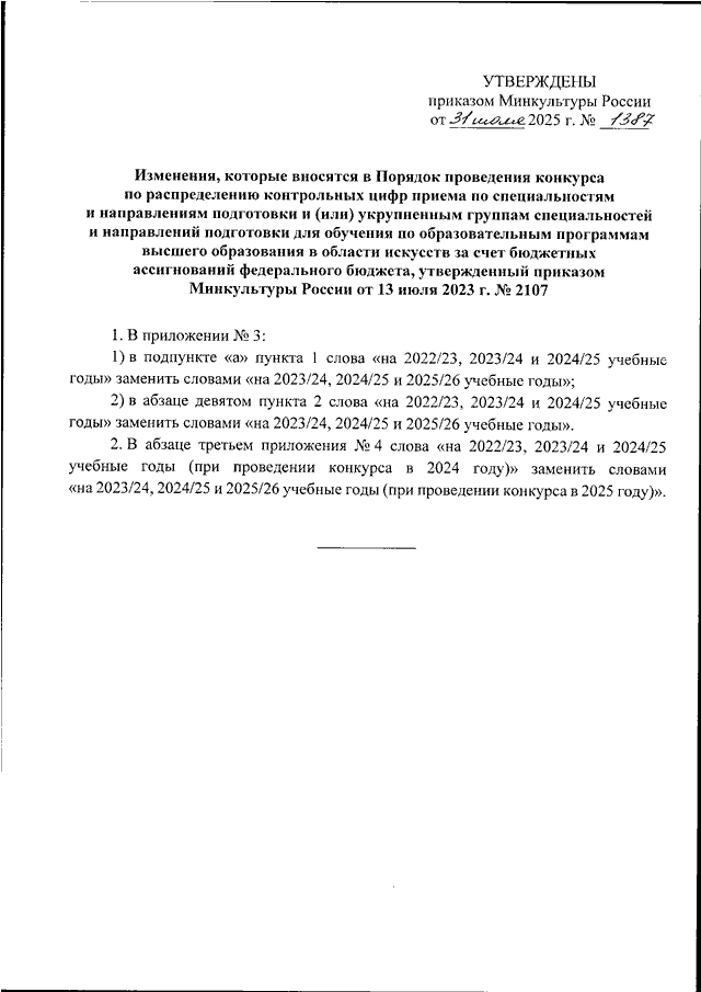 "О ВНЕСЕНИИ ИЗМЕНЕНИЙ В ПОРЯДОК ПРОВЕДЕНИЯ КОНКУРСА ПО РАСПРЕДЕЛЕНИЮ КОНТРОЛЬНЫХ ЦИФР ПРИЕМА ПО СПЕЦИАЛЬНОСТЯМ И НАПРАВЛЕНИЯМ ПОДГОТОВКИ И (ИЛИ) УКРУПНЕННЫМ ГРУППАМ СПЕЦИАЛЬНОСТЕЙ И НАПРАВЛЕНИЙ ПОДГОТОВКИ ДЛЯ ОБУЧЕНИЯ ПО ОБРАЗОВАТЕЛЬНЫМ ПРОГРАММАМ ВЫСШЕГО ОБРАЗОВАНИЯ В ОБЛАСТИ ИСКУССТВ ЗА СЧЕТ БЮДЖЕТНЫХ АССИГНОВАНИЙ ФЕДЕРАЛЬНОГО БЮДЖЕТА, УТВЕРЖДЕННЫЙ ПРИКАЗОМ МИНКУЛЬТУРЫ РОССИИ ОТ 13 ИЮЛЯ 2023 Г. N 2107"