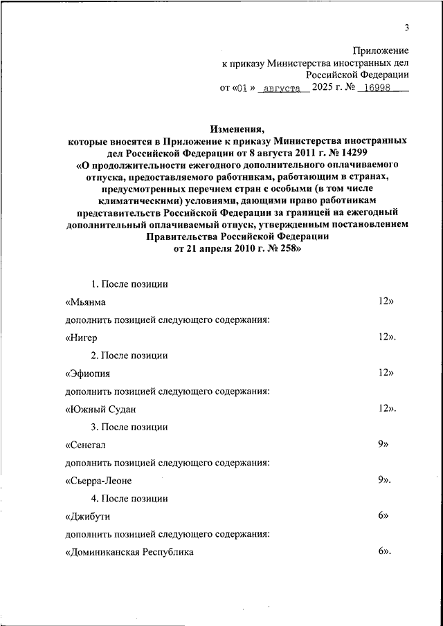 "О ВНЕСЕНИИ ИЗМЕНЕНИЙ В ПРИЛОЖЕНИЕ К ПРИКАЗУ МИНИСТЕРСТВА ИНОСТРАННЫХ ДЕЛ РОССИЙСКОЙ ФЕДЕРАЦИИ ОТ 8 АВГУСТА 2011 Г. N 14299 "О ПРОДОЛЖИТЕЛЬНОСТИ ЕЖЕГОДНОГО ДОПОЛНИТЕЛЬНОГО ОПЛАЧИВАЕМОГО ОТПУСКА, ПРЕДОСТАВЛЯЕМОГО РАБОТНИКАМ, РАБОТАЮЩИМ В СТРАНАХ, ПРЕДУСМОТРЕННЫХ ПЕРЕЧНЕМ СТРАН С ОСОБЫМИ (В ТОМ ЧИСЛЕ КЛИМАТИЧЕСКИМИ) УСЛОВИЯМИ, ДАЮЩИМИ ПРАВО РАБОТНИКАМ ПРЕДСТАВИТЕЛЬСТВ РОССИЙСКОЙ ФЕДЕРАЦИИ ЗА ГРАНИЦЕЙ НА ЕЖЕГОДНЫЙ ДОПОЛНИТЕЛЬНЫЙ ОПЛАЧИВАЕМЫЙ ОТПУСК, УТВЕРЖДЕННЫМ ПОСТАНОВЛЕНИЕМ ПРАВИТЕЛЬСТВА РОССИЙСКОЙ ФЕДЕРАЦИИ ОТ 21 АПРЕЛЯ 2010 Г. N 258"