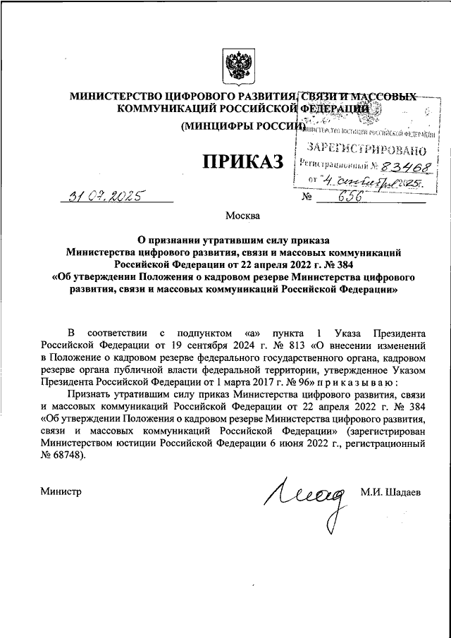 ПРИКАЗ Минцифры России от 31.07.2025 N 656