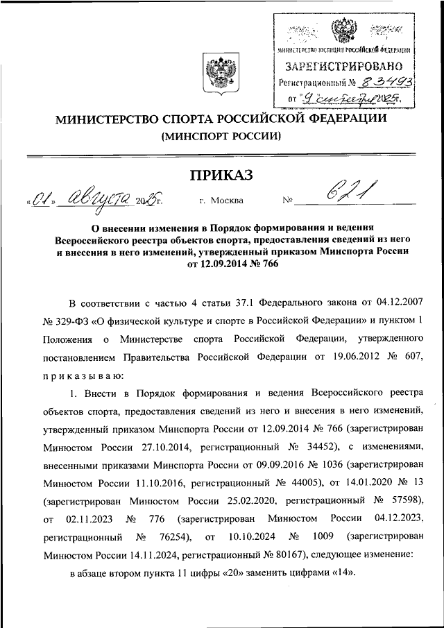 ПРИКАЗ Минспорта РФ от 01.08.2025 N 621