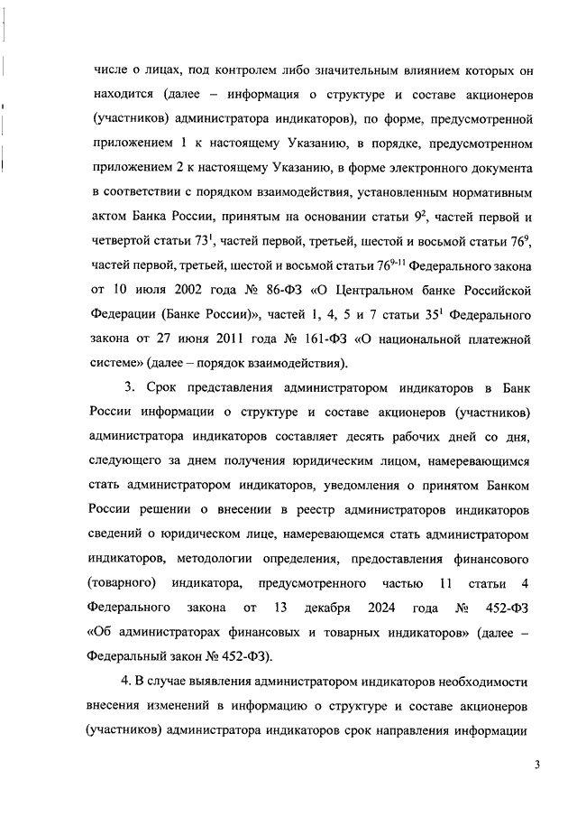 "О ПОРЯДКЕ И СРОКАХ ПРЕДСТАВЛЕНИЯ В БАНК РОССИИ АДМИНИСТРАТОРОМ ИНДИКАТОРОВ ИНФОРМАЦИИ О СТРУКТУРЕ И СОСТАВЕ СВОИХ АКЦИОНЕРОВ (УЧАСТНИКОВ), ЕЕ ФОРМЕ, ПОРЯДКЕ ОСУЩЕСТВЛЕНИЯ БАНКОМ РОССИИ ОЦЕНКИ СООТВЕТСТВИЯ ЛИЦА, УКАЗАННОГО В ЧАСТИ 1 СТАТЬИ 6 ФЕДЕРАЛЬНОГО ЗАКОНА ОТ 13 ДЕКАБРЯ 2024 Г. N 452-ФЗ "ОБ АДМИНИСТРАТОРАХ ФИНАНСОВЫХ И ТОВАРНЫХ ИНДИКАТОРОВ", ТРЕБОВАНИЯМ, УСТАНОВЛЕННЫМ УКАЗАННЫМ ФЕДЕРАЛЬНЫМ ЗАКОНОМ"