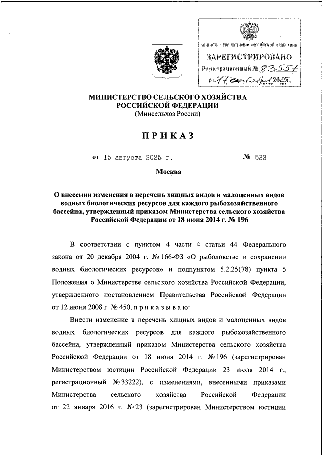 ПРИКАЗ Минсельхоза РФ от 15.08.2025 N 533