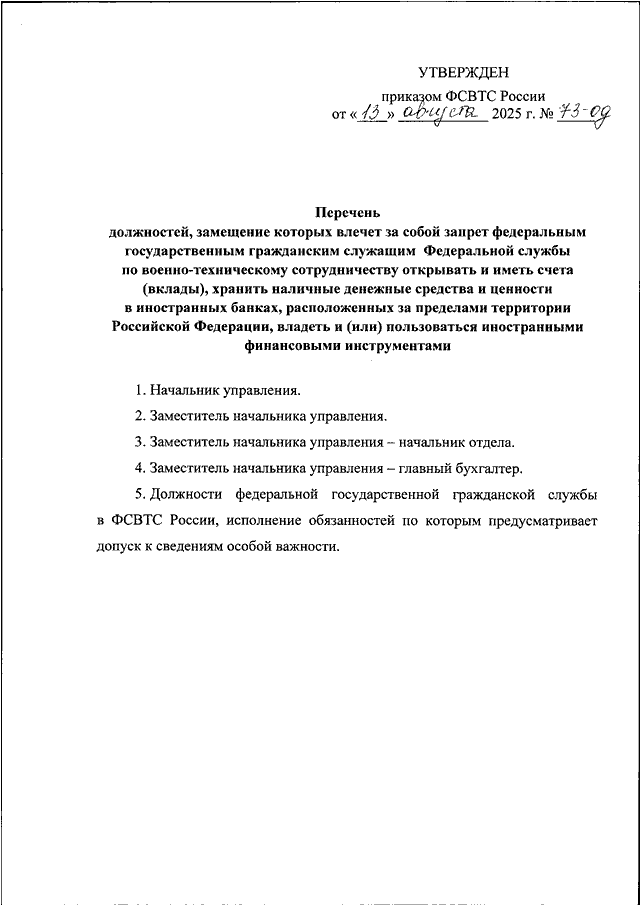 "ОБ УТВЕРЖДЕНИИ ПЕРЕЧНЯ ДОЛЖНОСТЕЙ, ЗАМЕЩЕНИЕ КОТОРЫХ ВЛЕЧЕТ ЗА СОБОЙ ЗАПРЕТ ФЕДЕРАЛЬНЫМ ГОСУДАРСТВЕННЫМ ГРАЖДАНСКИМ СЛУЖАЩИМ ФЕДЕРАЛЬНОЙ СЛУЖБЫ ПО ВОЕННО - ТЕХНИЧЕСКОМУ СОТРУДНИЧЕСТВУ ОТКРЫВАТЬ И ИМЕТЬ СЧЕТА (ВКЛАДЫ), ХРАНИТЬ НАЛИЧНЫЕ ДЕНЕЖНЫЕ СРЕДСТВА И ЦЕННОСТИ В ИНОСТРАННЫХ БАНКАХ, РАСПОЛОЖЕННЫХ ЗА ПРЕДЕЛАМИ ТЕРРИТОРИИ РОССИЙСКОЙ ФЕДЕРАЦИИ, ВЛАДЕТЬ И (ИЛИ) ПОЛЬЗОВАТЬСЯ ИНОСТРАННЫМИ ФИНАНСОВЫМИ ИНСТРУМЕНТАМИ"
