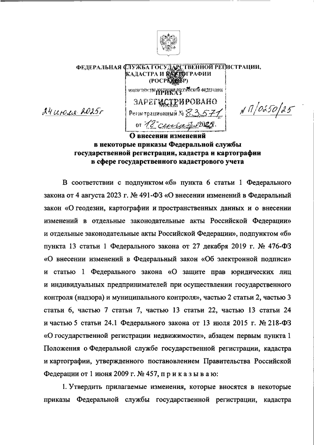 ПРИКАЗ Росреестра от 24.07.2025 N П/0250/25