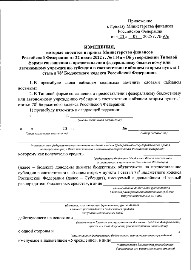 "О ВНЕСЕНИИ ИЗМЕНЕНИЙ В ПРИКАЗ МИНИСТЕРСТВА ФИНАНСОВ РОССИЙСКОЙ ФЕДЕРАЦИИ ОТ 22 ИЮЛЯ 2022 Г. N 114Н "ОБ УТВЕРЖДЕНИИ ТИПОВОЙ ФОРМЫ СОГЛАШЕНИЯ О ПРЕДОСТАВЛЕНИИ ФЕДЕРАЛЬНОМУ БЮДЖЕТНОМУ ИЛИ АВТОНОМНОМУ УЧРЕЖДЕНИЮ СУБСИДИИ В СООТВЕТСТВИИ С АБЗАЦЕМ ВТОРЫМ ПУНКТА 1 СТАТЬИ 78.1 БЮДЖЕТНОГО КОДЕКСА РОССИЙСКОЙ ФЕДЕРАЦИИ"