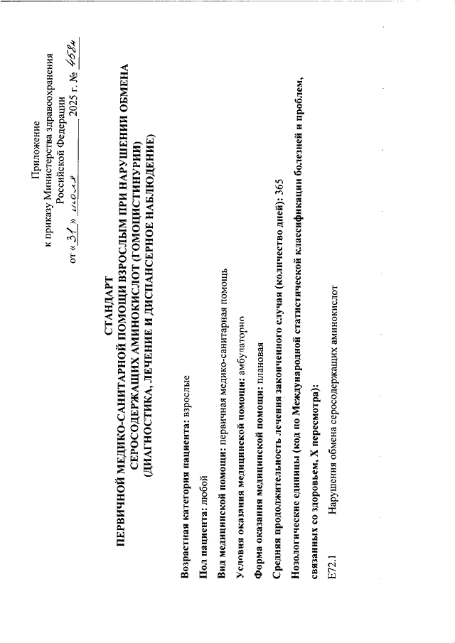 "ОБ УТВЕРЖДЕНИИ СТАНДАРТА ПЕРВИЧНОЙ МЕДИКО - САНИТАРНОЙ ПОМОЩИ ВЗРОСЛЫМ ПРИ НАРУШЕНИИ ОБМЕНА СЕРОСОДЕРЖАЩИХ АМИНОКИСЛОТ (ГОМОЦИСТИНУРИИ) (ДИАГНОСТИКА, ЛЕЧЕНИЕ И ДИСПАНСЕРНОЕ НАБЛЮДЕНИЕ)"