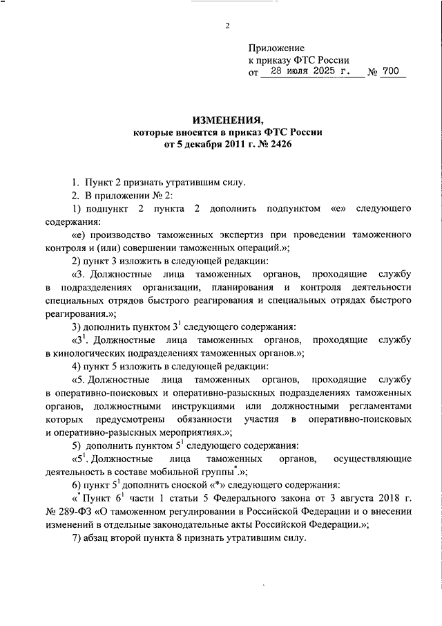 ПРИКАЗ ФТС РФ от 28.07.2025 N 700