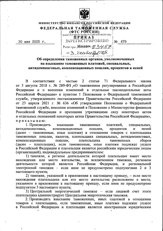 ПРИКАЗ ФТС РФ от 30.05.2025 N 479