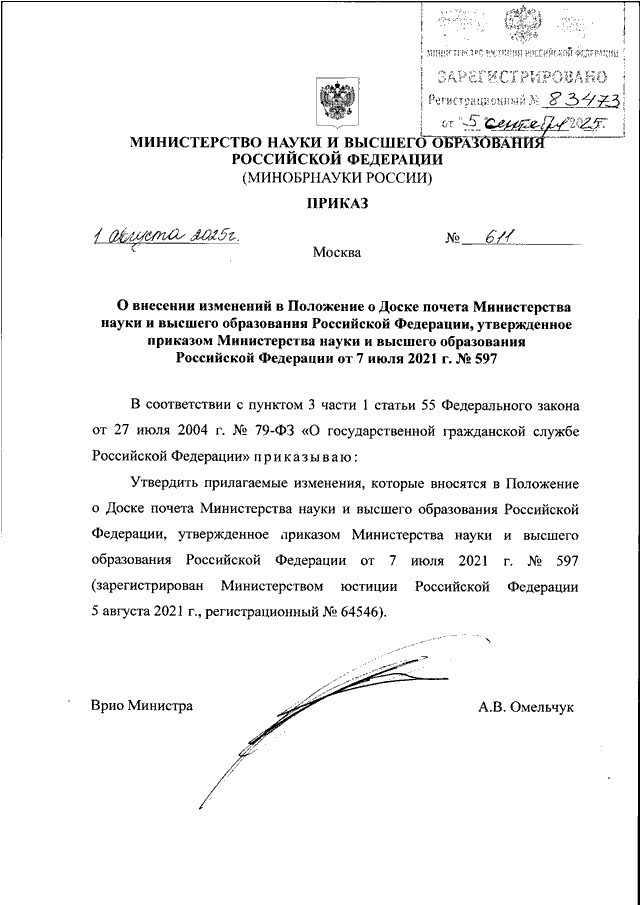 ПРИКАЗ Минобрнауки РФ от 01.08.2025 N 611