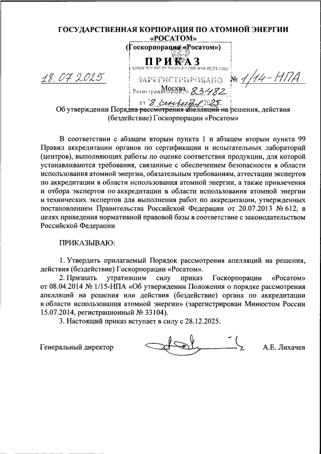 "Росатом" от 18.07.2025 N 1/14-НПА "ОБ УТВЕРЖДЕНИИ ПОРЯДКА РАССМОТРЕНИЯ АПЕЛЛЛЯЦИЙ НА РЕШЕНИЯ, ДЕЙСТВИЯ (БЕЗДЕЙСТВИЕ) ГОСКОРПОРАЦИИ "РОСАТОМ"