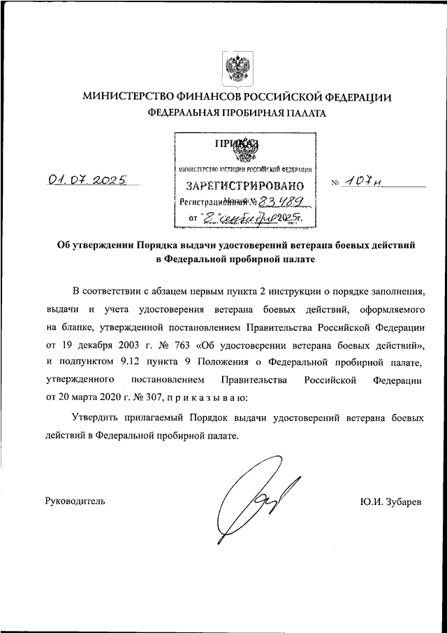 "ОБ УТВЕРЖДЕНИИ ПОРЯДКА ВЫДАЧИ УДОСТОВЕРЕНИЙ ВЕТЕРАНА БОЕВЫХ ДЕЙСТВИЙ В ФЕДЕРАЛЬНОЙ ПРОБИРНОЙ ПАЛАТЕ"