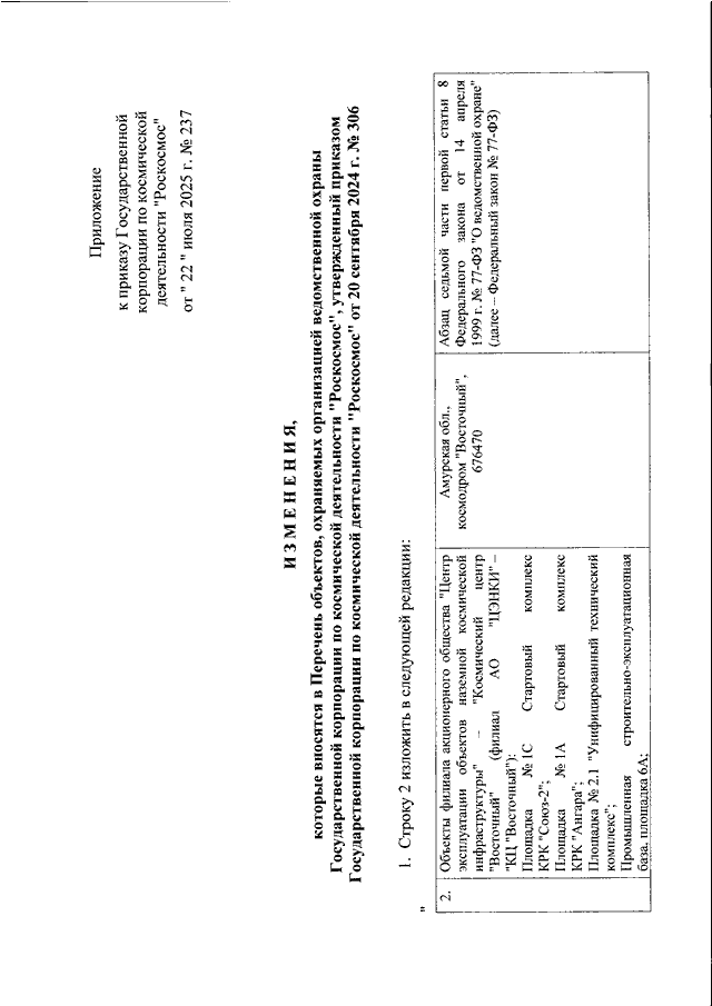 "Роскосмос" от 22.07.2025 N 237 "О ВНЕСЕНИИ ИЗМЕНЕНИЙ В ПЕРЕЧЕНЬ ОБЪЕКТОВ, ОХРАНЯЕМЫХ ОРГАНИЗАЦИЕЙ ВЕДОМСТВЕННОЙ ОХРАНЫ ГОСУДАРСТВЕННОЙ КОРПОРАЦИИ ПО КОСМИЧЕСКОЙ ДЕЯТЕЛЬНОСТИ "РОСКОСМОС", УТВЕРЖДЕННЫЙ ПРИКАЗОМ ГОСУДАРСТВЕННОЙ КОРПОРАЦИИ ПО КОСМИЧЕСКОЙ ДЕЯТЕЛЬНОСТИ "РОСКОСМОС" ОТ 20 СЕНТЯБРЯ 2024 Г. N 306"