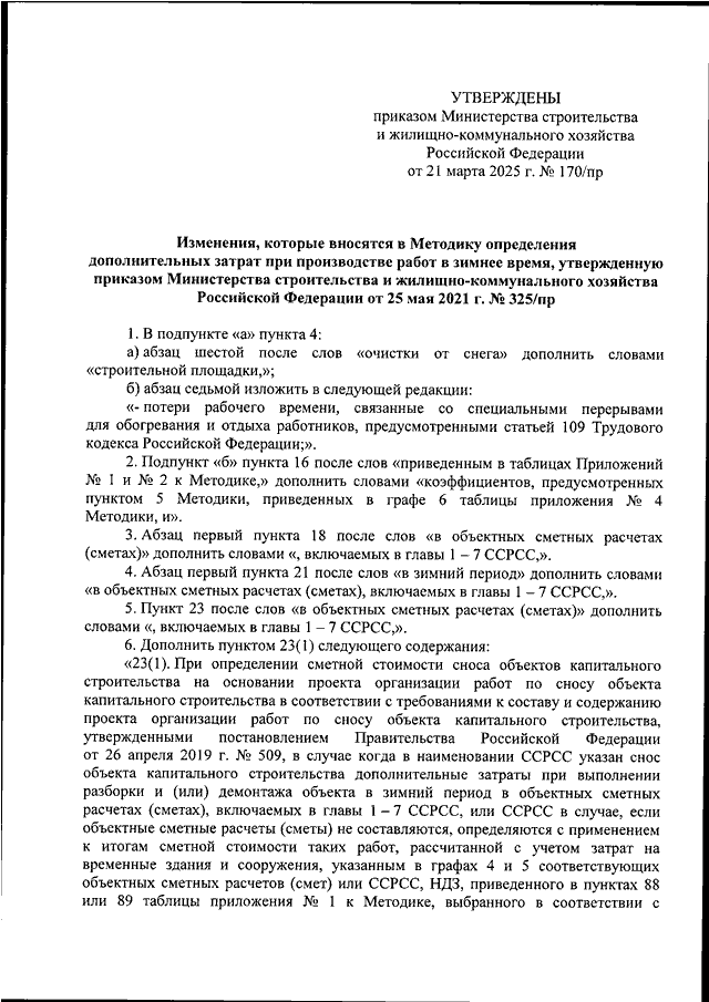 "О ВНЕСЕНИИ ИЗМЕНЕНИЙ В МЕТОДИКУ ОПРЕДЕЛЕНИЯ ДОПОЛНИТЕЛЬНЫХ ЗАТРАТ ПРИ ПРОИЗВОДСТВЕ РАБОТ В ЗИМНЕЕ ВРЕМЯ, УТВЕРЖДЕННУЮ ПРИКАЗОМ МИНИСТЕРСТВА СТРОИТЕЛЬСТВА И ЖИЛИЩНО - КОММУНАЛЬНОГО ХОЗЯЙСТВА РОССИЙСКОЙ ФЕДЕРАЦИИ ОТ 25 МАЯ 2021 Г. N 325/ПР"