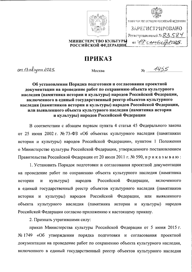 ПРИКАЗ Минкультуры РФ от 13.08.2025 N 1455