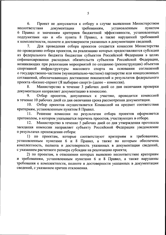 "ОБ УТВЕРЖДЕНИИ ПОРЯДКА ПРОВЕДЕНИЯ ОТБОРА ПРОЕКТОВ, НА РЕАЛИЗАЦИЮ КОТОРЫХ ПРЕДОСТАВЛЯЮТСЯ СУБСИДИИ ИЗ ФЕДЕРАЛЬНОГО БЮДЖЕТА БЮДЖЕТАМ СУБЪЕКТОВ РОССИЙСКОЙ ФЕДЕРАЦИИ В ЦЕЛЯХ СОФИНАНСИРОВАНИЯ РАСХОДНЫХ ОБЯЗАТЕЛЬСТВ СУБЪЕКТОВ РОССИЙСКОЙ ФЕДЕРАЦИИ, ВОЗНИКАЮЩИХ ПРИ РЕАЛИЗАЦИИ МЕРОПРИЯТИЙ ПО СОЗДАНИЮ (РЕКОНСТРУКЦИИ) ОБЪЕКТОВ СПОРТИВНОЙ ИНФРАСТРУКТУРЫ МАССОВОГО СПОРТА НА ОСНОВАНИИ СОГЛАШЕНИЙ О ГОСУДАРСТВЕННО - ЧАСТНОМ (МУНИЦИПАЛЬНО - ЧАСТНОМ) ПАРТНЕРСТВЕ ИЛИ КОНЦЕССИОННЫХ СОГЛАШЕНИЙ, ОБЕСПЕЧИВАЮЩИХ ДОСТИЖЕНИЕ ПОКАЗАТЕЛЕЙ И РЕЗУЛЬТАТОВ ФЕДЕРАЛЬНОГО ПРОЕКТА "БИЗНЕС - СПРИНТ (Я ВЫБИРАЮ СПОРТ)"