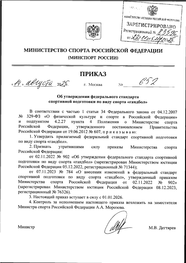 ПРИКАЗ Минспорта РФ от 14.08.2025 N 652
