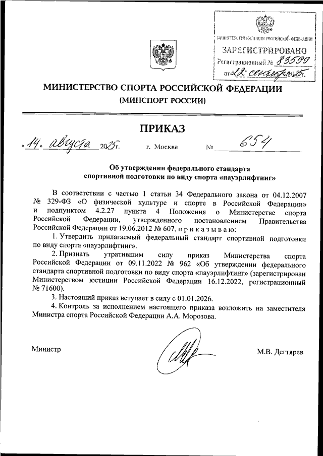 ПРИКАЗ Минспорта РФ от 14.08.2025 N 654