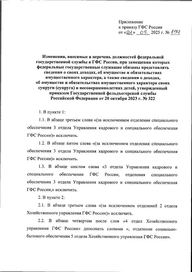 "О ВНЕСЕНИИ ИЗМЕНЕНИЙ В ПЕРЕЧЕНЬ ДОЛЖНОСТЕЙ ФЕДЕРАЛЬНОЙ ГОСУДАРСТВЕННОЙ СЛУЖБЫ В ГФС РОССИИ, ПРИ ЗАМЕЩЕНИИ КОТОРЫХ ФЕДЕРАЛЬНЫЕ ГОСУДАРСТВЕННЫЕ СЛУЖАЩИЕ ОБЯЗАНЫ ПРЕДСТАВЛЯТЬ СВЕДЕНИЯ О СВОИХ ДОХОДАХ, ОБ ИМУЩЕСТВЕ И ОБЯЗАТЕЛЬСТВАХ ИМУЩЕСТВЕННОГО ХАРАКТЕРА, А ТАКЖЕ СВЕДЕНИЯ О ДОХОДАХ, ОБ ИМУЩЕСТВЕ И ОБЯЗАТЕЛЬСТВАХ ИМУЩЕСТВЕННОГО ХАРАКТЕРА СВОИХ СУПРУГИ (СУПРУГА) И НЕСОВЕРШЕННОЛЕТНИХ ДЕТЕЙ, УТВЕРЖДЕННЫЙ ПРИКАЗОМ ГОСУДАРСТВЕННОЙ ФЕЛЬДЪЕГЕРСКОЙ СЛУЖБЫ РОССИЙСКОЙ ФЕДЕРАЦИИ ОТ 20 ОКТЯБРЯ 2023 Г. N 322"