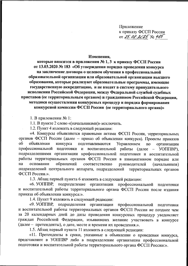 "О ВНЕСЕНИИ ИЗМЕНЕНИИ В ПРИЛОЖЕНИЯ N 1, 3 К ПРИКАЗУ ФССП РОССИИ ОТ 13.03.2020 N 183 "ОБ УТВЕРЖДЕНИИ ПОРЯДКА ПРОВЕДЕНИЯ КОНКУРСА НА ЗАКЛЮЧЕНИЕ ДОГОВОРА О ЦЕЛЕВОМ ОБУЧЕНИИ В ПРОФЕССИОНАЛЬНОЙ ОБРАЗОВАТЕЛЬНОЙ ОРГАНИЗАЦИИ ИЛИ ОБРАЗОВАТЕЛЬНОЙ ОРГАНИЗАЦИИ ВЫСШЕГО ОБРАЗОВАНИЯ, КОТОРЫЕ РЕАЛИЗУЮТ ОБРАЗОВАТЕЛЬНЫЕ ПРОГРАММЫ, ИМЕЮЩИЕ ГОСУДАРСТВЕННУЮ АККРЕДИТАЦИЮ, И НЕ ВХОДЯТ В СИСТЕМУ ПРИНУДИТЕЛЬНОГО ИСПОЛНЕНИЯ РОССИЙСКОЙ ФЕДЕРАЦИИ, МЕЖДУ ФЕДЕРАЛЬНОЙ СЛУЖБОЙ СУДЕБНЫХ ПРИСТАВОВ (ЕЕ ТЕРРИТОРИАЛЬНЫМ ОРГАНОМ) И ГРАЖДАНИНОМ РОССИЙСКОЙ ФЕДЕРАЦИИ, МЕТОДИКИ ОСУЩЕСТВЛЕНИЯ КОНКУРСНЫХ ПРОЦЕДУР И ПОРЯДКА ФОРМИРОВАНИЯ КОНКУРСНОЙ КОМИССИИ ФССП РОССИИ (ЕЕ ТЕРРИТОРИАЛЬНОГО ОРГАНА)"