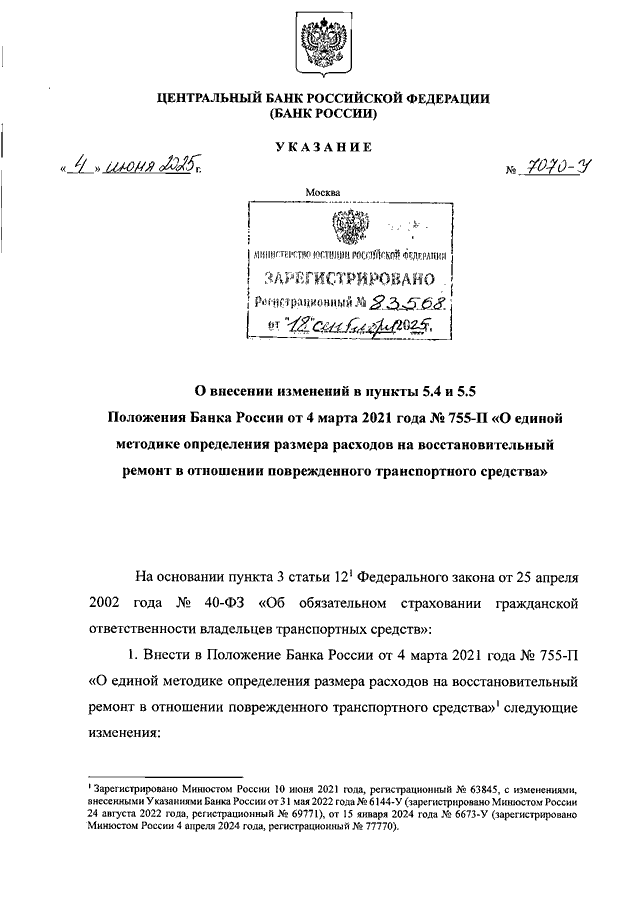 УКАЗАНИЕ ЦБ РФ от 04.06.2025 N 7070-У