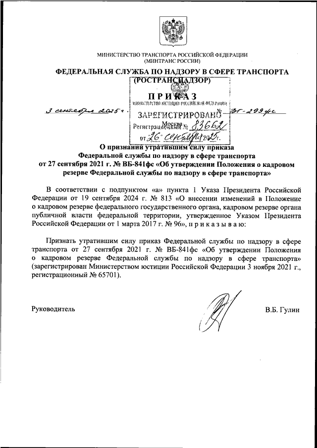 В СФЕРЕ ТРАНСПОРТА ОТ 27 СЕНТЯБРЯ 2021 Г. N ВБ-841ФС "ОБ