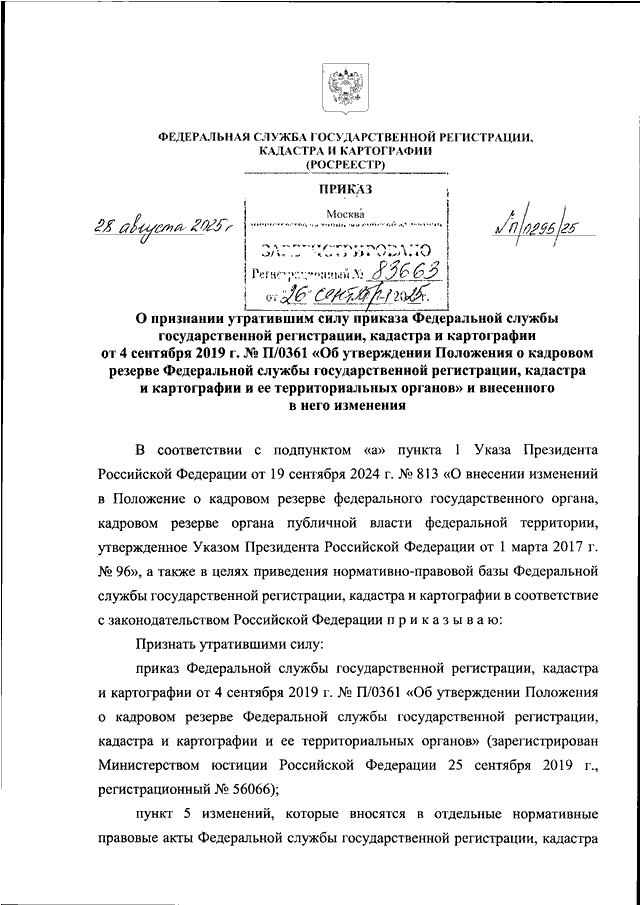 ПРИКАЗ Росреестра от 28.08.2025 N П/0295/25